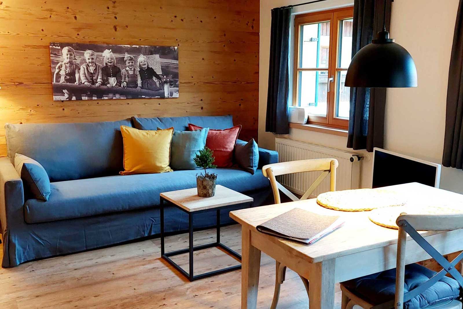 Die 40m² große gemütliche Ferienwohnung hat einen ebenerdigen Zugang und besitzt einen kleinen Ostbalkon. Es erwartet Sie ein offen gestalteter Wohn-Essbereich mit vollausgestatteter Küchenzeile, Esstisch und Couch. Im separaten Schlafzimmer lädt ein vom Schreiner gefertigtes Bett zum Träumen ein. Die Wohnung ist individuell und mit einem gelungenen Mix aus modernem und ländlichem Wohnstil ausgestattet und wird durch ein kleines feines Bad abgerundet.